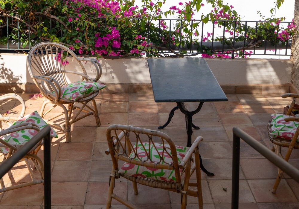Außen Es gibt zahlreiche schattige Plätzchen, und die 25 Meter lange, mit Jasmin und Weinreben bewachsene Terrasse lädt zum Essen im Freien ein. Angrenzend befindet sich ein überdachter Barbereich, in dem Gäste sich nach Belieben zurückziehen oder gesellig sein können. Der Padelplatz liegt direkt neben dem Poolbereich.